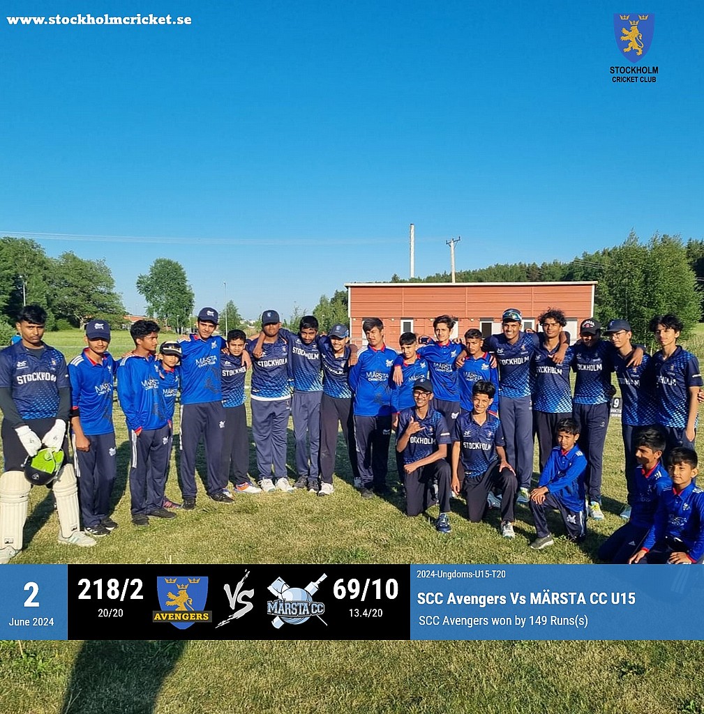 Chasing a daunting target, MÄRSTA CC U15 faltered under pressure and were bundled out for just 69 runs in 13.4 overs. Ghazal Ahmed was the top scorer with 26 runs off 17 balls, followed by Muhammad Bilal Choudhry who managed 21 runs off 22 balls. None of the other batsmen could reach double figures, as the SCC Avengers bowlers dominated the innings.